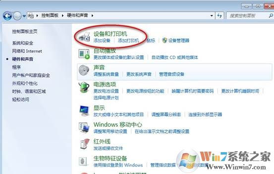 2、然后在“硬件和聲音””里點(diǎn)擊“設(shè)備和打印機(jī)”;