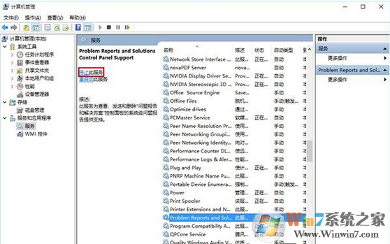 10、在中間找到 Problem Reports and Solutions Control Panel Support 服務,單擊后在左側(cè)點擊“停止此服務”;