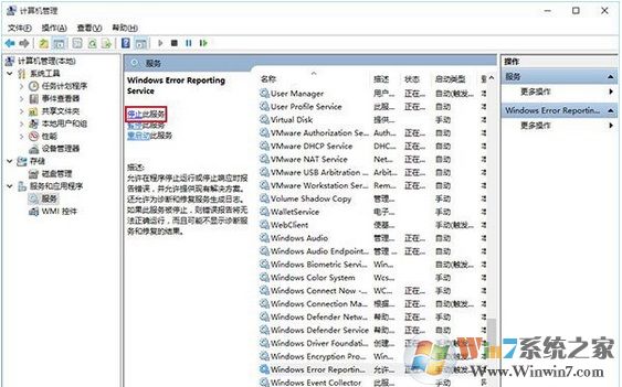 11、再找到 Windows Error Reporting Service,單擊后同樣在左側(cè)點擊“停止此服務”。