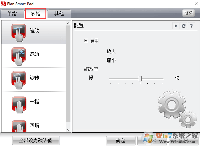 界面二,如下圖,須先勾選“多指手勢”選項(xiàng),然后根據(jù)需要,分別勾選“雙指”、“三指”等選項(xiàng)即可。