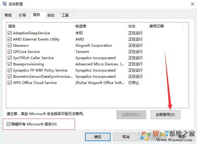 2、點擊“服務(wù)”標(biāo)簽卡,勾選“隱藏所有的微軟服務(wù)”然后點擊“全部禁用”;
