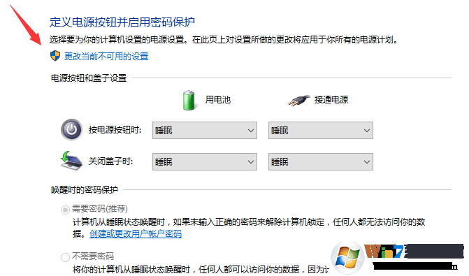 2、點擊‘選擇電源按鈕的功能’,點擊“更改當(dāng)前不可用的設(shè)置”;