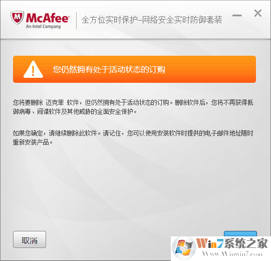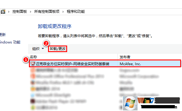 2、在程序列表界面,找到邁克菲程序(一般標(biāo)記有“邁克菲”或“Mcafee”字樣),然后點(diǎn)擊“卸載/更改”,如圖: