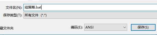 2、接下來選擇【文件】--【另存為】,【文件類型】選擇【所有文件】,名稱隨意,擴展名為“.cmd”,如:組策略.bat 把它保存下來;