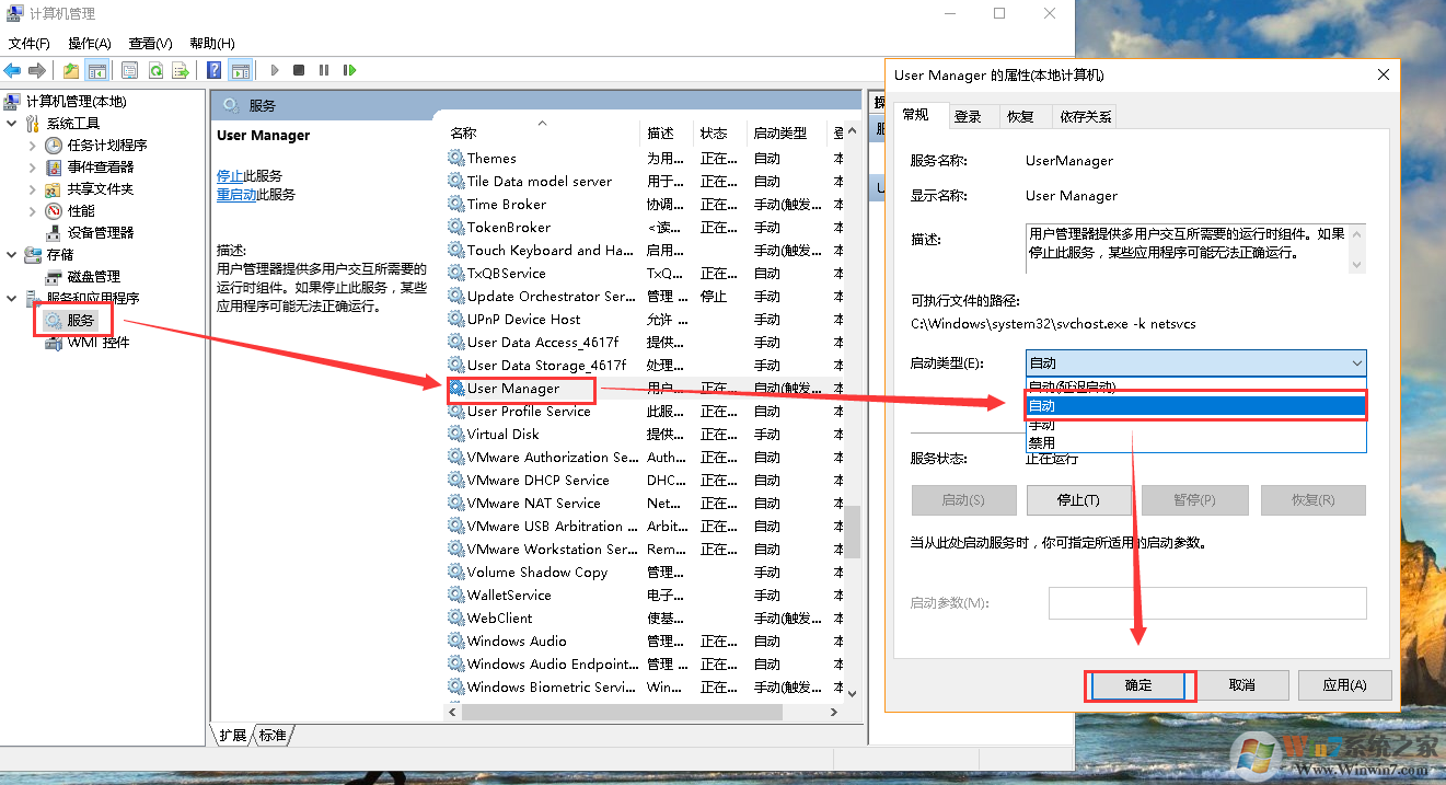 雙擊打開“User Manager”,在“啟動類型”里面把“禁用”改成“自動”,然后點擊確定保存。