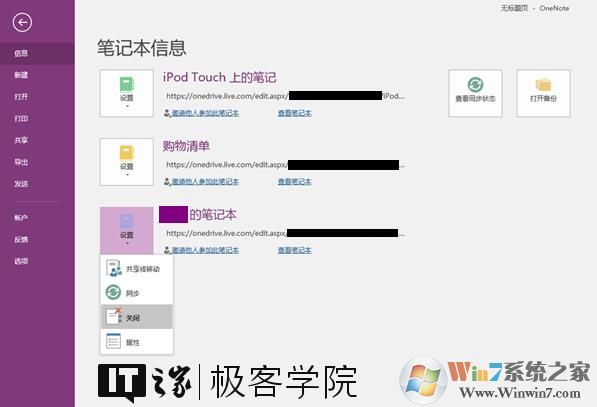 點擊Robbin功能區(qū)中的文件-信息,你將在此看到你所有的OneNote筆記,選擇你的目標筆記,點擊它前面的設置按鈕,在它的下拉菜單中點擊關閉。