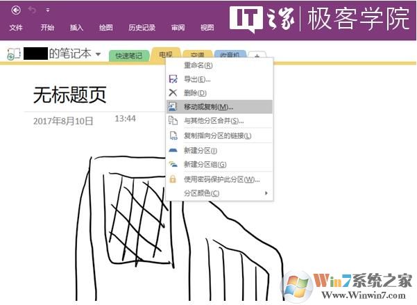 在OneNote筆記中,把鼠標光標放在有問題的那個筆記分區(qū)上,點擊右鍵,選擇移動或復制。
