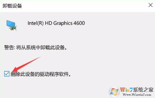 3、勾選“刪除此設備的驅動程序軟件”,點擊卸載,然后重啟電腦。