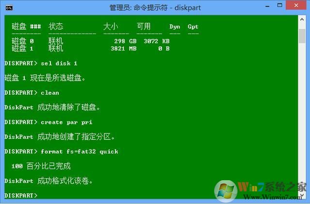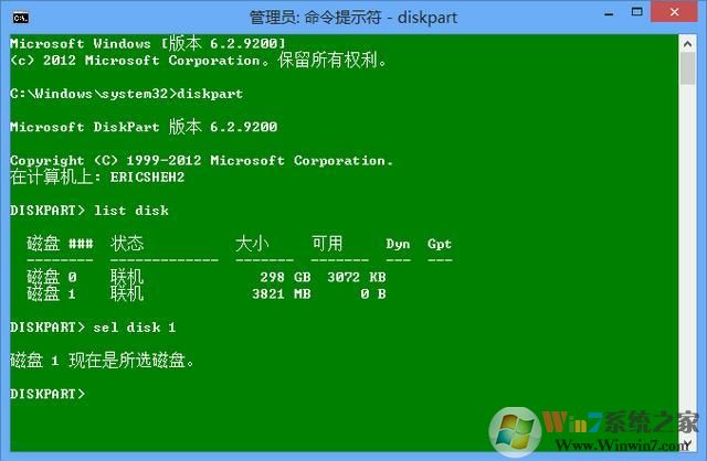 2. 執(zhí)行 diskpart, 以及 list disk,找到你的U盤的編號(本例中是1),然后通過 select disk 1 選中該磁盤;