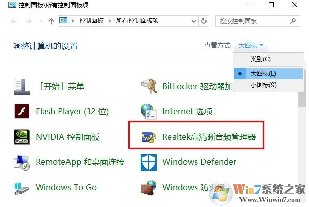 2、將控制面板右上角的查看方式修改為【大圖標(biāo)】,在下面點(diǎn)擊【Realtek高清晰音頻管理器】;