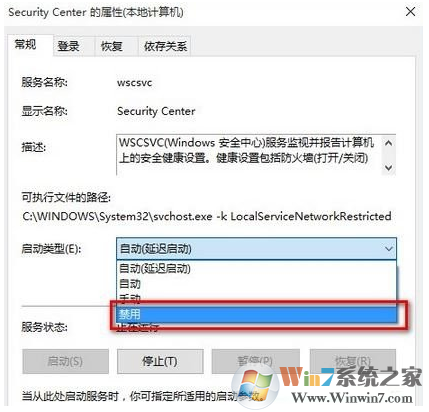 3、在SecurityCenter屬性界面,停止該服務并設置啟動類型為“禁用”即可!