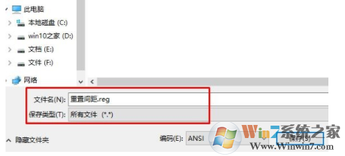 3、選好保存路徑,為了方便直接存桌面吧,將下面的【保存類型】改成“所有文件”,將文件名修改為“重置間距.reg” 點擊【保存】;