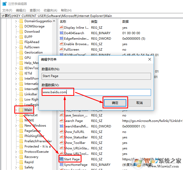 3、在Main對(duì)應(yīng)右側(cè)窗口中找到Start Page 雙擊打開,將數(shù)值數(shù)據(jù)修改為需要設(shè)置的瀏覽器主頁(yè):如cncxm.com ,輸入后點(diǎn)擊確定保存設(shè)置即可!