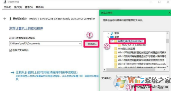 5、點(diǎn)擊瀏覽按鈕,選擇之前解壓出來(lái)的amd sata controller文件夾,點(diǎn)擊確定;
