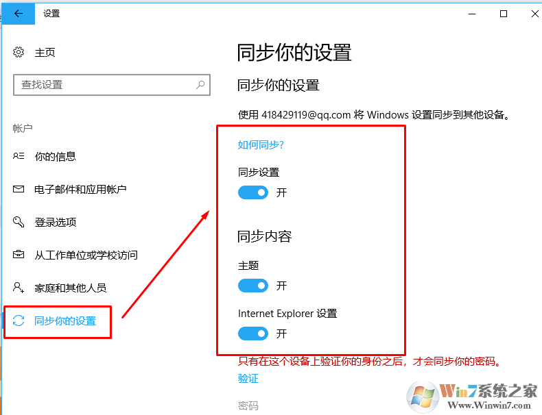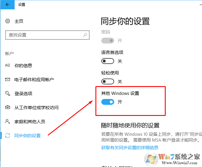 3、登陸賬號后選擇到同步你的設(shè)置。將自己想要的同步設(shè)置打開即可。