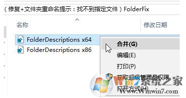 3、按自己系統(tǒng)的位數(shù)選擇注冊表文件,單擊右鍵,選擇【合并】,在彈出的框中點擊【是】即可。(win10 64位系統(tǒng)使用FolderDescriptions x64,win10 32位系統(tǒng)使用FolderDescriptions x86)。