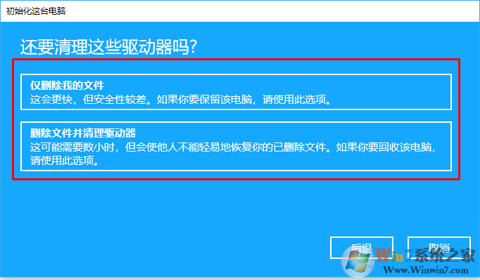 7、選擇是徹底重置保留系統(tǒng)文件還是徹底的重置整個盤。