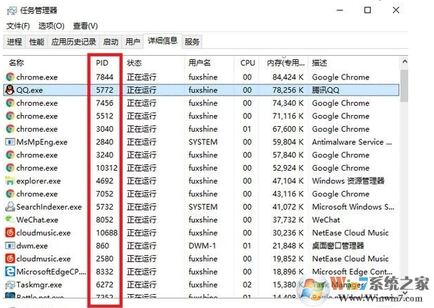 1、先打開任務(wù)管理器(ctrl+shift+esc),點擊“詳細(xì)信息”一欄,查看想關(guān)閉程序的”PID“(程序進(jìn)程編號)是什么;