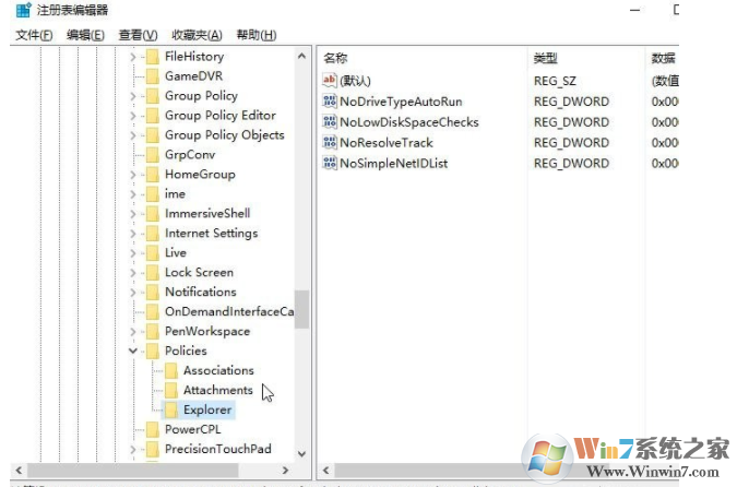 2、在注冊表中依次展開:HKEY_CURRENT_USER\SOFTWARE\Microsoft\Windows\CurrentVersion\Policies\Explorer ;