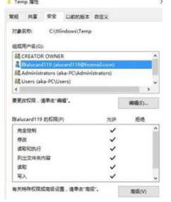 2、進(jìn)入Temp文件夾屬性中的安全高級設(shè)置,在這一窗口寫入用戶名稱,檢查后確定即可;