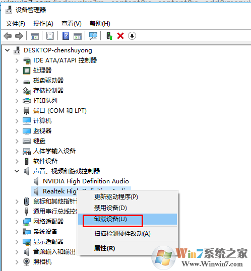 1、win+x打開設(shè)備管理器,在設(shè)備管理器中卸載聲卡的驅(qū)動程序。