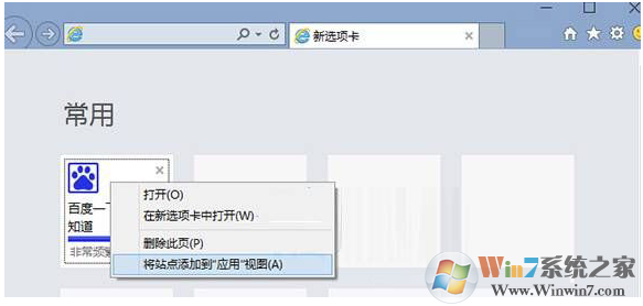 2、這是會(huì)彈出我們經(jīng)常使用的一些網(wǎng)站,我們?cè)趯?duì)應(yīng)網(wǎng)頁(yè)窗口中單擊右鍵,選擇【將站點(diǎn)添加到“應(yīng)用”視圖】;