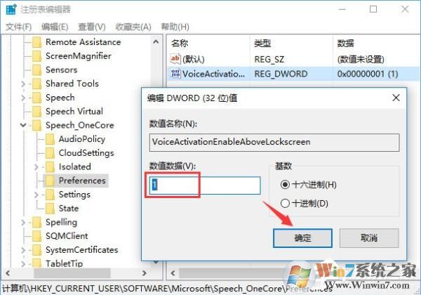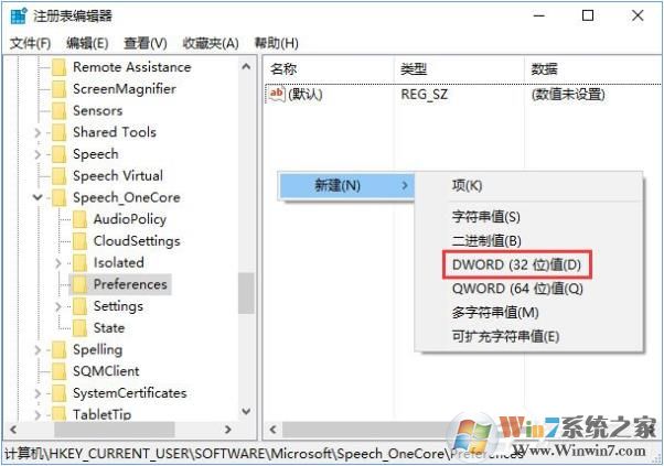 2、在左側(cè)依次展開:HKEY_CURRENT_USER\SOFTWARE\Microsoft\Speech_OneCore\Preferences ,在右側(cè)空白單擊右鍵,選擇【新建】-【DWORD(32位)值】,將該值命名為VoiceActivationEnableAboveLockscreen的,將其值設(shè)置為【1】即可。