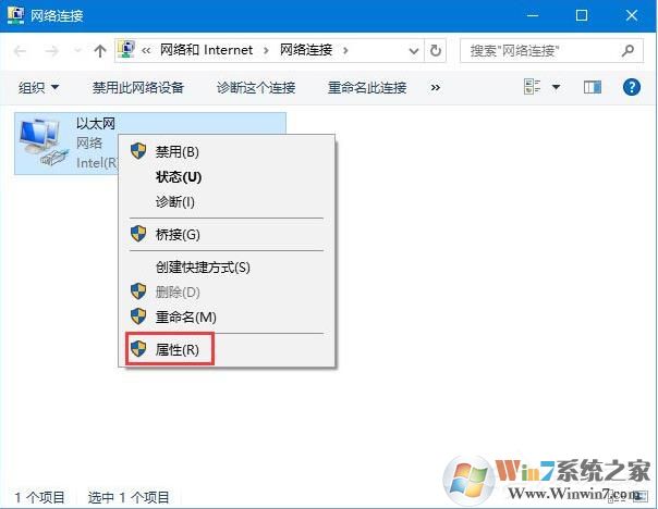 3、在打開的窗口中找到當前連接的網(wǎng)卡上單擊右鍵,選擇【屬性】;