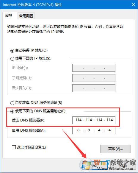 5、點擊【使用下面的DNS 服務(wù)器地址】,然后在下面填入:114.114.114.114 點擊【確定】-【確定】保存設(shè)置即可解決問題!