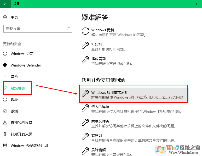 2、點擊疑難解答,然后找到應(yīng)用商店應(yīng)用疑難解答。