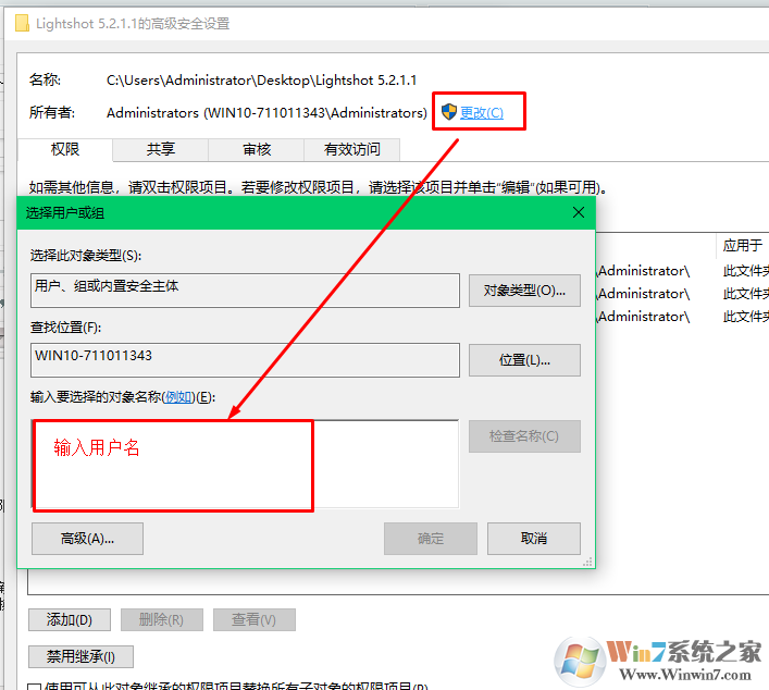 4、選擇所有者旁邊的更改按鈕并輸入您的用戶名。
