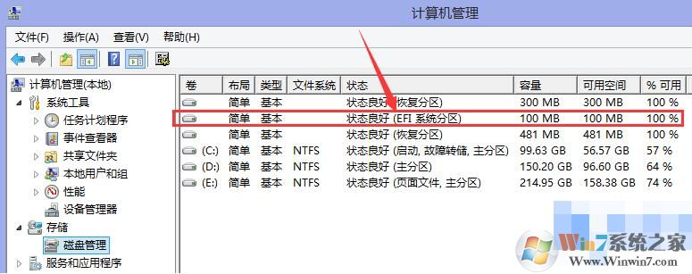 右鍵“這臺(tái)電腦”(我的電腦) - 管理 - 存儲(chǔ) - 磁盤管理,打開后查看右邊是否有EFI系統(tǒng)分區(qū),如下圖所示: