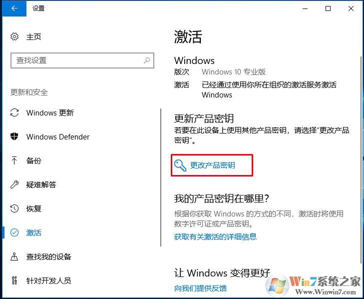 3、左側(cè)選擇激活,在右側(cè)就可以看到更換產(chǎn)品密鑰的選項了,點(diǎn)擊即可