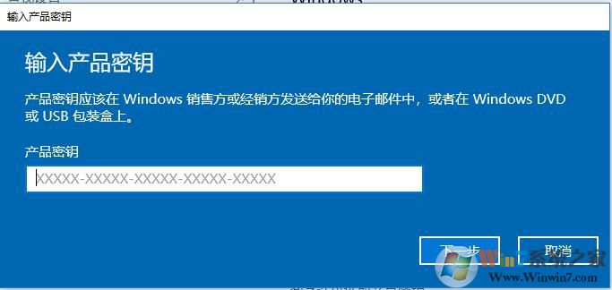 4、在出現(xiàn)的產(chǎn)品密鑰輸入窗口中,輸入你要更換的Win10產(chǎn)品密鑰就可以了。
