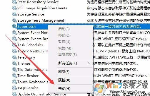 4、這時(shí)會打開服務(wù)窗口,在服務(wù)列表中找到Superfetch服務(wù)項(xiàng),右鍵點(diǎn)擊該服務(wù)項(xiàng),在彈出菜單中點(diǎn)擊“屬性”菜單項(xiàng)