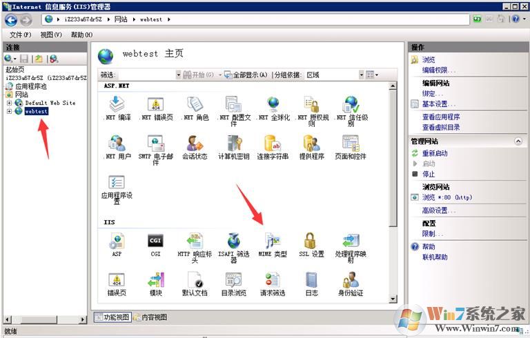 2. 選中您的站點(diǎn),點(diǎn)擊【MIME類型】。打開后的窗口顯示了當(dāng)前IIS上已有的MIME類型。