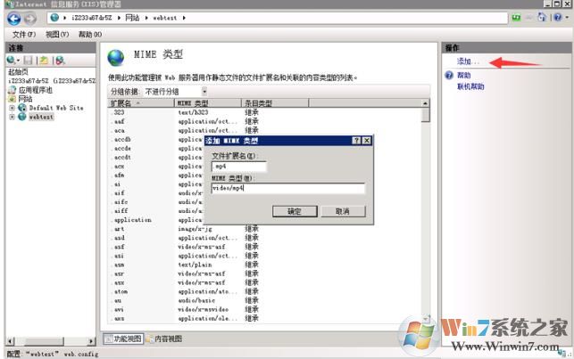 3. 點(diǎn)擊右側(cè)的“添加”,可以添加一個(gè)MIME類型,比如您要添加mp4文件的MIME類型,“文件擴(kuò)展名”可以填寫為.mp4,MIME類型可以填寫video/mp4(擴(kuò)展名對(duì)了一般就可以下載了)