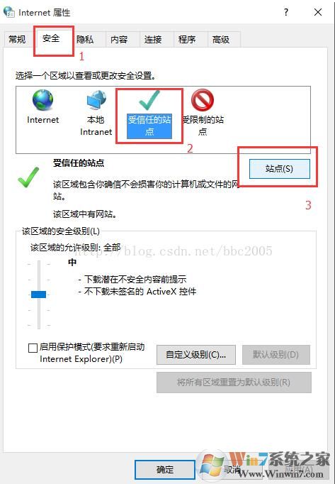 1、打開internet選項選擇-安全-受信任的站點-站點