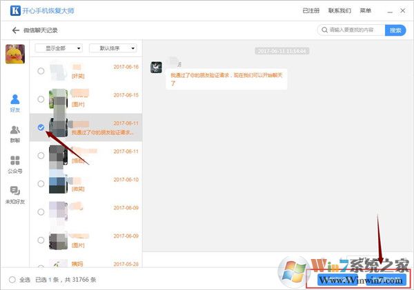 【四】:點(diǎn)擊“微信聊天記錄”圖標(biāo)之后,開(kāi)心手機(jī)恢復(fù)大師會(huì)對(duì)手機(jī)內(nèi)刪除的記錄進(jìn)行掃描和分析,掃描需要一定時(shí)間,4-7分鐘左右。掃描完成后,跳轉(zhuǎn)到微信聊天記錄的預(yù)覽界面。預(yù)覽界面左側(cè)是微信好友信息,右側(cè)是對(duì)于的聊天記錄。微信聊天記錄是兩種顏色顯示:黑色的表示仍存在手機(jī)中的記錄;橘黃色的表示已經(jīng)刪除的記錄;最后找到想要恢復(fù)的微信聊天記錄以后,我們?cè)谄渥髠?cè)方框中勾選,然后點(diǎn)擊“恢復(fù)到電腦”即可恢復(fù)。