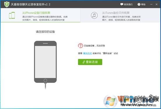 3、然后,你可以看到,當(dāng)蘋(píng)果手機(jī)連接到電腦上后,運(yùn)行天盾微信聊天記錄恢復(fù)軟件后,軟件將會(huì)開(kāi)始檢測(cè)設(shè)備并自動(dòng)連接。成功連接后,我們?cè)谲浖纳戏近c(diǎn)擊“開(kāi)始從iPhone中恢復(fù)數(shù)據(jù)”就可以。