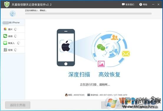 【三】:然后會(huì)跳轉(zhuǎn)到恢復(fù)主界面。主界面顯示的圖標(biāo)包括:微信聊天記錄、短信、通訊錄、照片、備忘錄等共計(jì)17種。我們點(diǎn)擊“微信聊天記錄圖標(biāo)”,然后軟件開(kāi)始掃描蘋(píng)果手機(jī)中的微信聊天記錄。