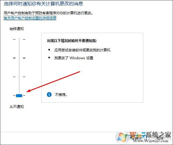 2、在“用戶賬戶控制設置”窗口中將滑塊拖到到最底部并確認,如圖所示: