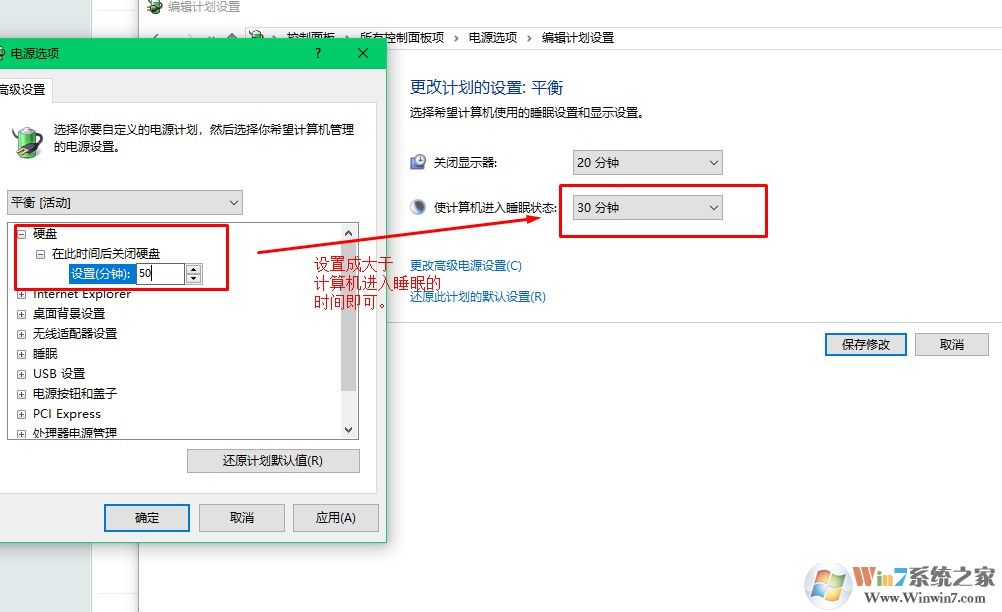 4、在高級電源設(shè)置中找到硬盤并將關(guān)閉時(shí)間設(shè)置為比睡眠時(shí)間晚10分鐘即可。