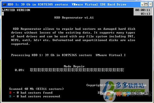 6、程序自動(dòng)掃描你選擇的硬盤,不用去管,當(dāng)HDD掃描到壞道后會在進(jìn)度條上顯示紅色的“B”字,隨后就開始自動(dòng)修復(fù),修復(fù)好的用藍(lán)色的“R”字標(biāo)注。掃描并修復(fù)完后就可以正常的是使用硬盤了