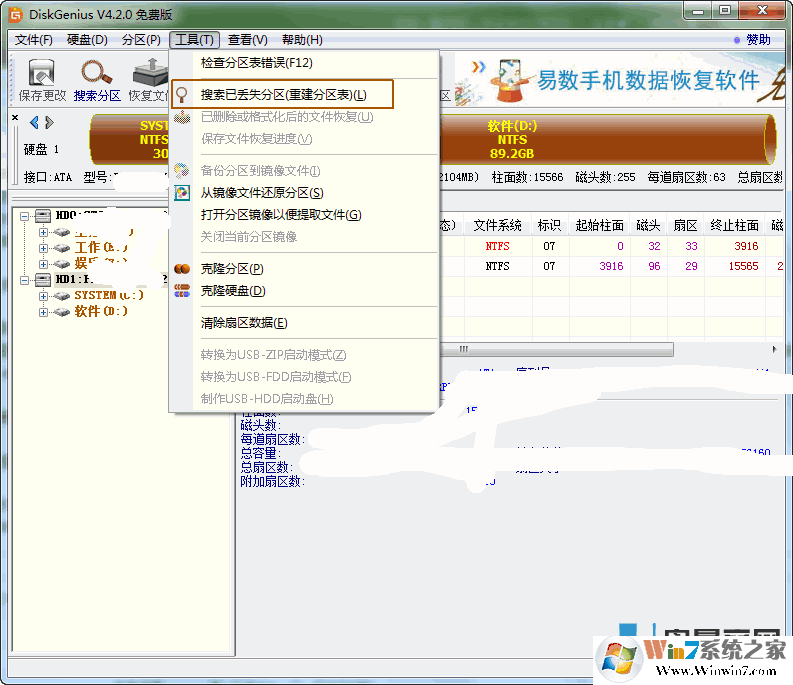 3、然后點(diǎn)擊菜單欄的“工具(T)”,繼續(xù)點(diǎn)“搜索已丟失分區(qū)(重建分區(qū)表)”,如下圖