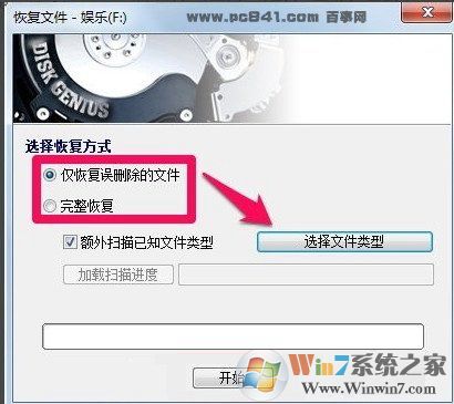 三、之后DiskGenius工具會彈出選擇恢復(fù)方式,這里有“僅恢復(fù)誤刪除的文件”或者選擇“完整恢復(fù)”,這里按照自己的需求選擇即可。同時(shí)diskgenius恢復(fù)數(shù)據(jù)時(shí)還可以選擇恢復(fù)的文件類型,如下圖所示。