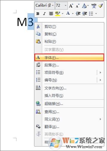 1、首先打開word文檔,直接輸入m3,此時m和3是一樣大的,我我們選中后面的 3 ,選中后在3 上單擊鼠標(biāo)右鍵,選擇 字體;