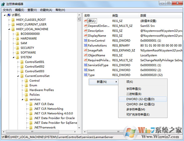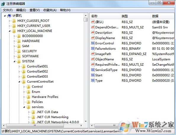 2、在注冊表編輯器中依次展開[HKEY_LOCAL_MACHINE\\SYSTEM\\CurrentControlSet\\Services\\lanmanserver];如下圖所示