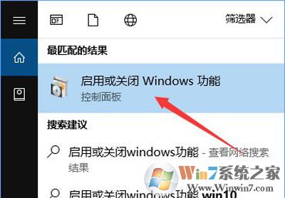 1、在任務(wù)欄搜索框中輸入“啟用或關(guān)閉Windows功能”,打開找到的項目,如圖所示: