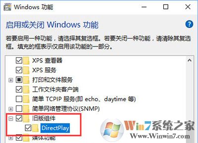 2、在Windows功能中找到“舊版組件”,展開,勾選“DirectPlay”功能,點擊“確定”,如圖所示:
